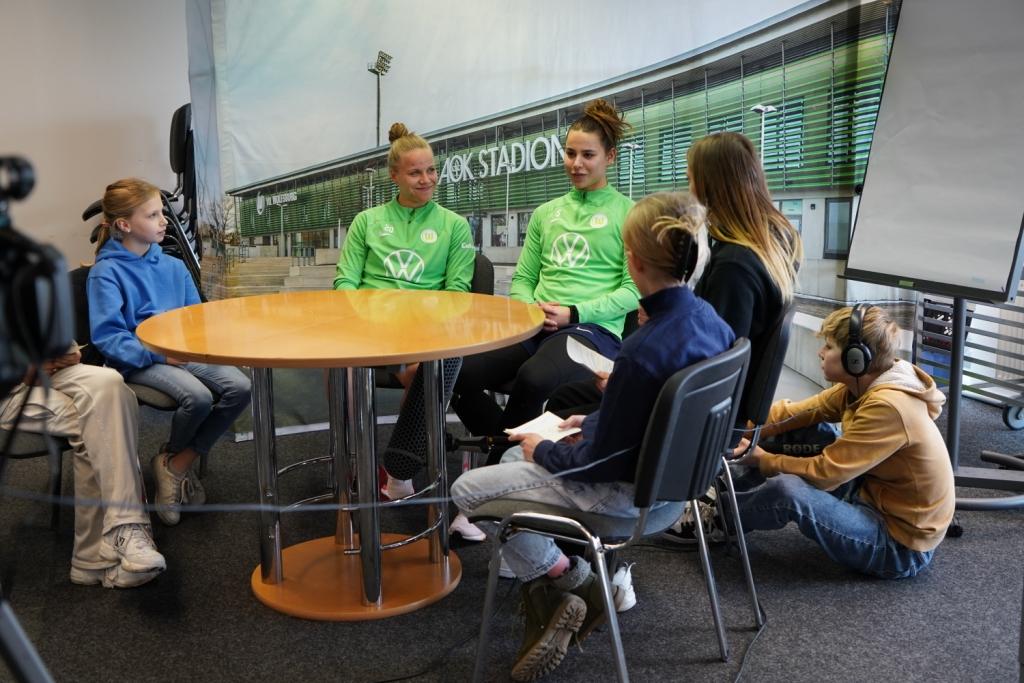 Die beiden Spielerinnen vom VfL Wolfsburg verraten, wer von ihnen besser Auto fährt und warum sie nicht zu spät zum Training kommen würden. Bei dem lebhaften Interview im Presseraum der VfL Geschäftsstelle geht es auch um die Zeit nach der beeindruckenden Frauen Fußball EM und um die Familien der beiden VfL-Profi Spielerinnen. Die 7. Klässler/innen haben sich akribisch auf das Gespräch vorbereitet und waren auch noch beim Filmschnitt kreativ. Einige Szenen mussten nachbearbeitet werden, das Team Henriette, Freya, Ghazal, Lucas, Jonas und Freddy (Bild/Ton) sowie Lina, Beeke und Maily, Teresa (Interviews) hat den Beitrag dennoch mit der Moderation passgenau abgerundet.