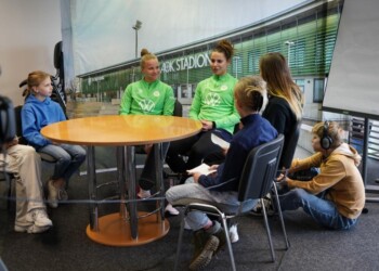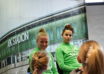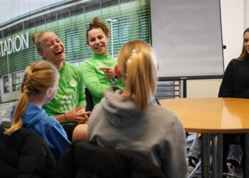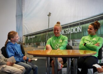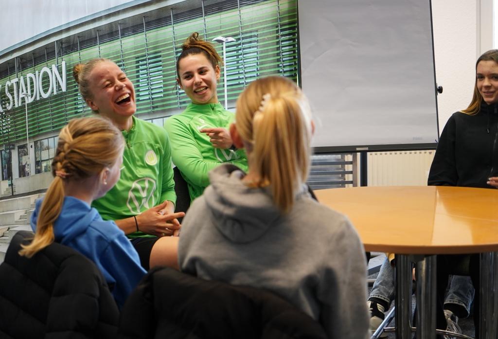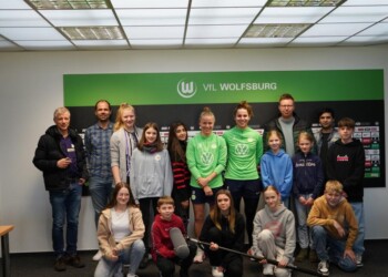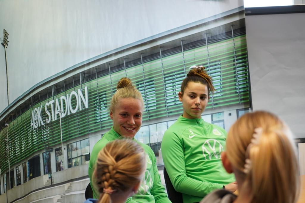 Als die schwedische Nationalspielerin Rebecka Blomqvist zum VfL Wolfsburg kam, hatte die Corona-Pandemie alles noch voll im Griff. Zusammen mit Joelle Wedemeyer holte sie seither eine Deutsche Meisterschaft und vier DFB-Pokalsiege. Am Trainingsgelände stellten sich die schwedische Stürmerin und die Abwehrspielerin aus Wolfenbüttel im Interview den gut vorbereiteten Schülerinnen des 8. und 9. Jahrgangs der IGS Gifhorn. Karla, Frieda, Mawa und Anna-Lena machten das Interview mit den sympathischen Fußballspielerinnen und hatten vor der Kamera mit dem Lampenfieber zu tun. Sophie und Fritzi führten durch ein Fußball-Ranking und Mia moderiert zum Beginn. Ghazal und Maily sorgten für das gute Bild. .