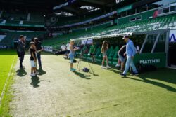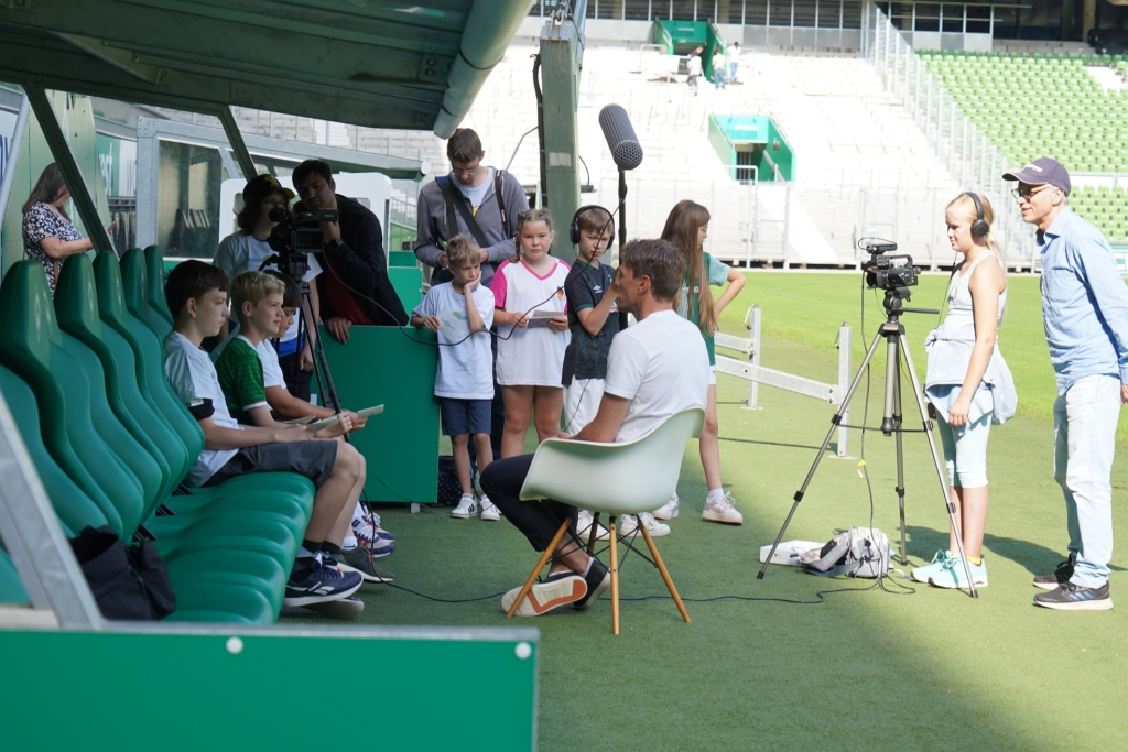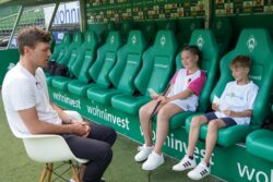 Für die engagierten SportXperten aus dem Ferienangebot der Samtgemeinde Thedinghausen zeigt sich der frühere Nationalspieler in seiner neuen Position als Geschäftsführer zum Anfassen. Gut, dass sich die zehn Kinder und Jugendlichen intensiv vorbereitet haben. Das Pausenangebot im Jugendtreff „El Castillo“ ist genau richtig, um die heißen Phasen der Anspannung mit Spaß und Spiel herunter zu kühlen. Clemens Fritz hat beim Dreh im Weserstadion sichtlich Spaß an den kniffligen Fragen und signiert zwischendurch immer wieder Trikots und Autogrammkarten für die gesamte Familie der SportXperten.